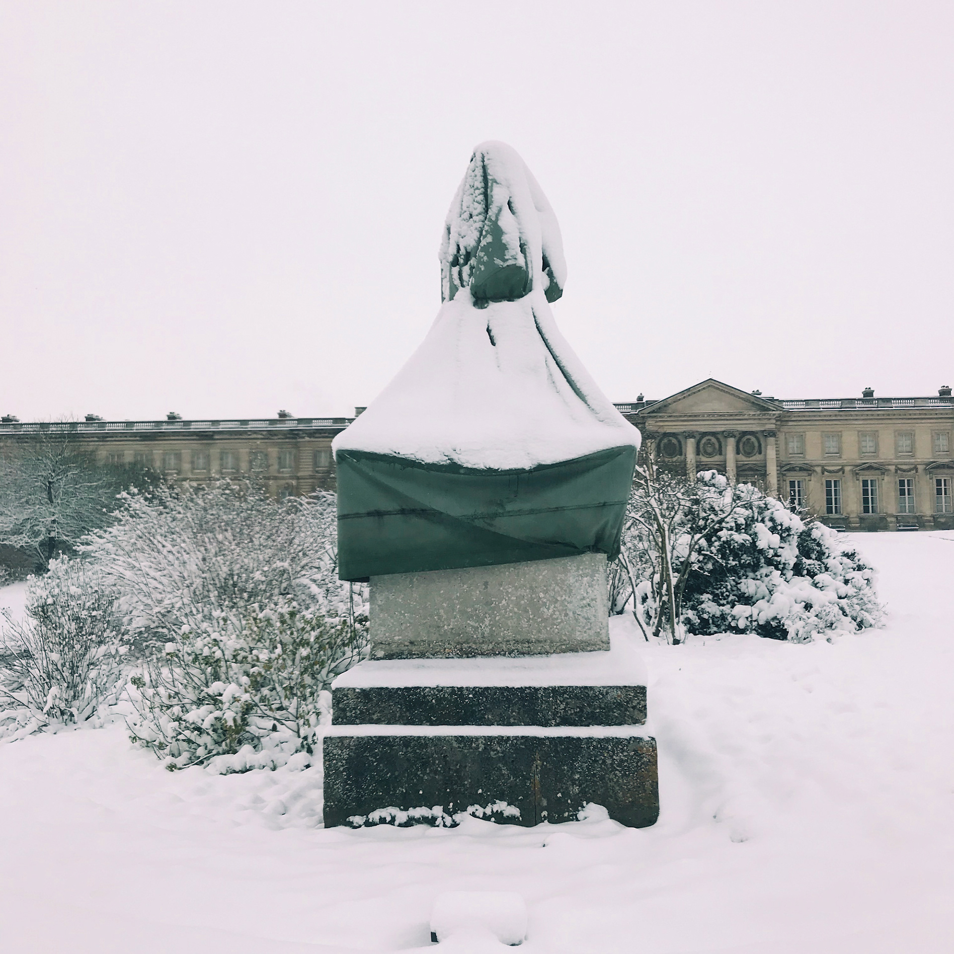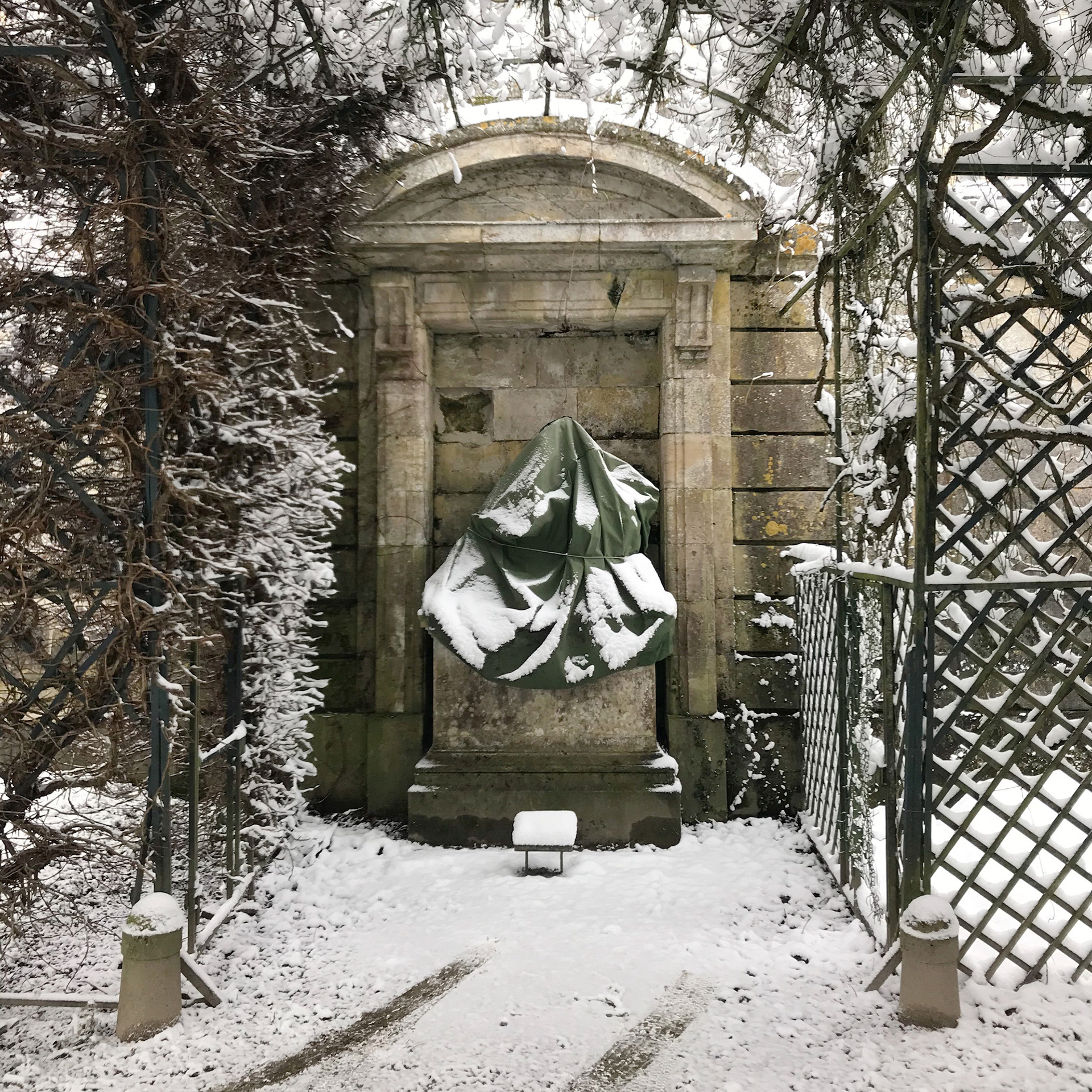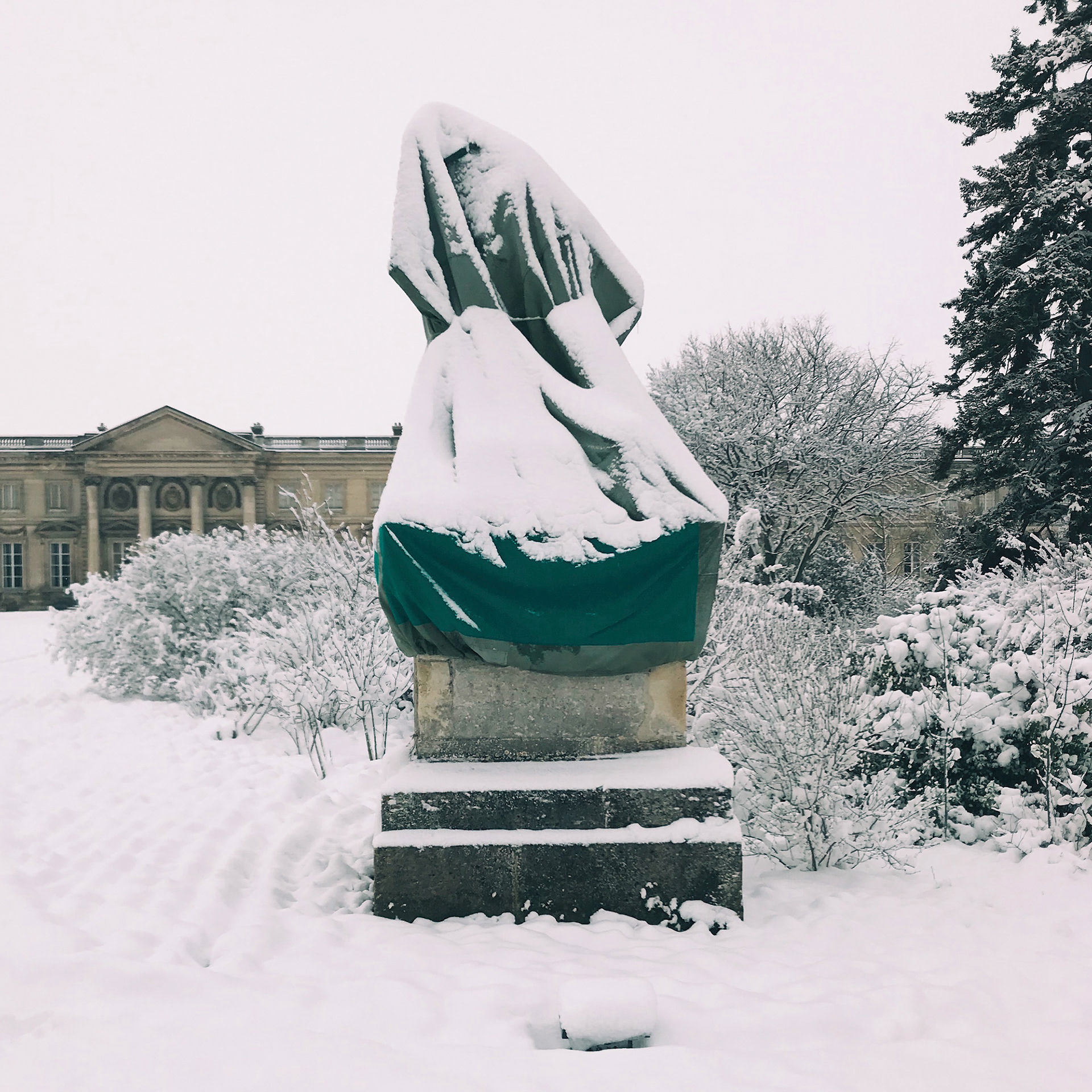 Sculptures "emballées" pour l'hiver. Château de Compiègne (Oise). Février 2018