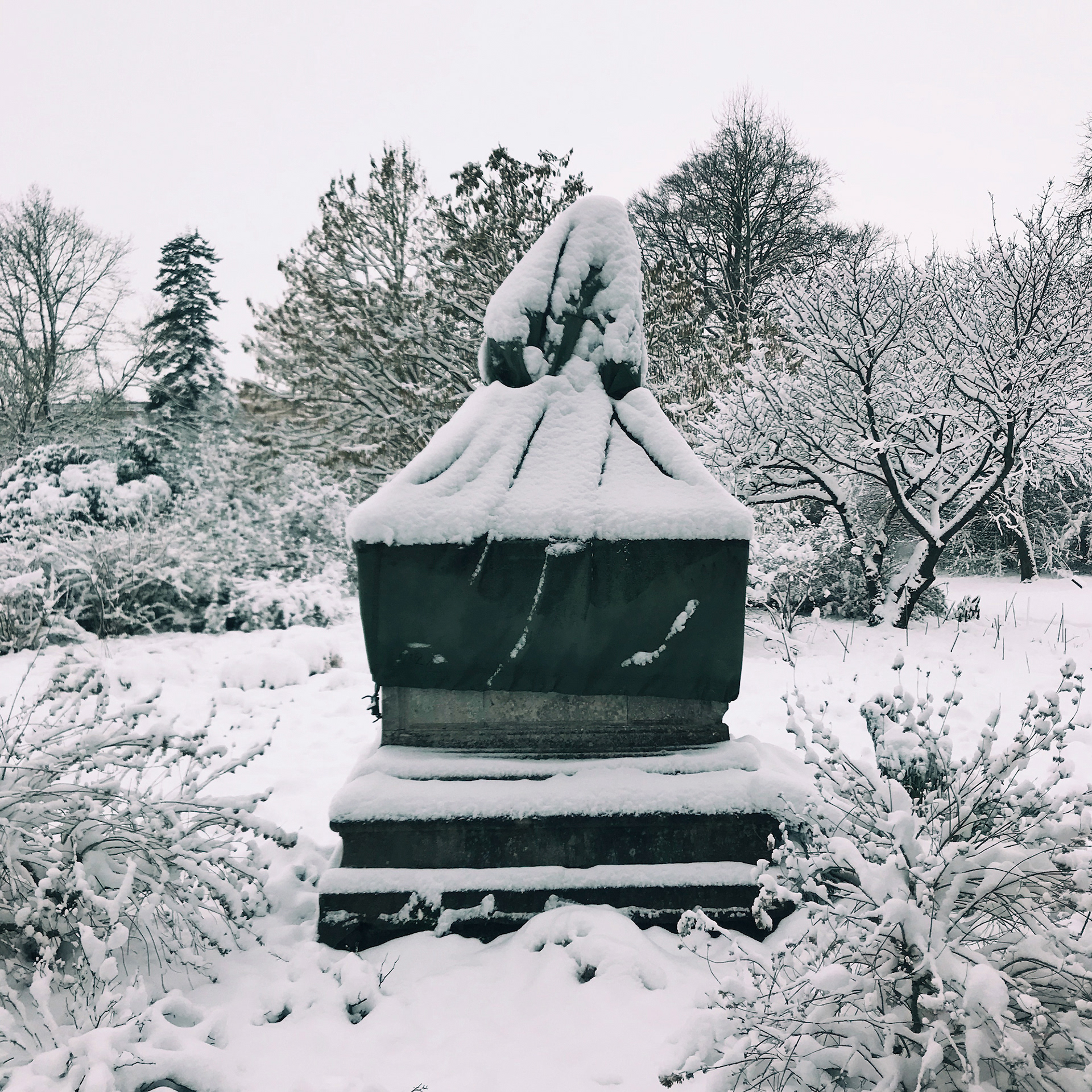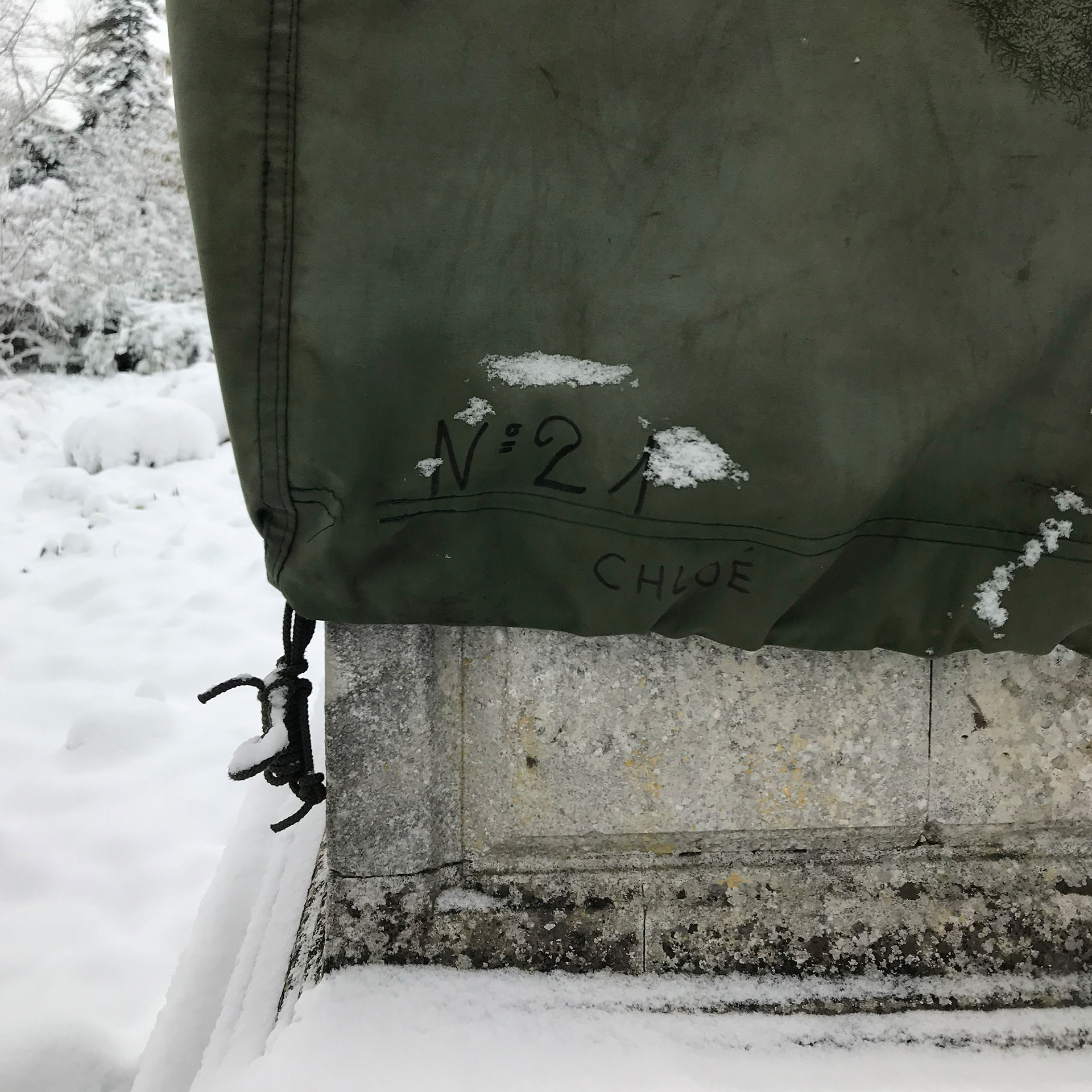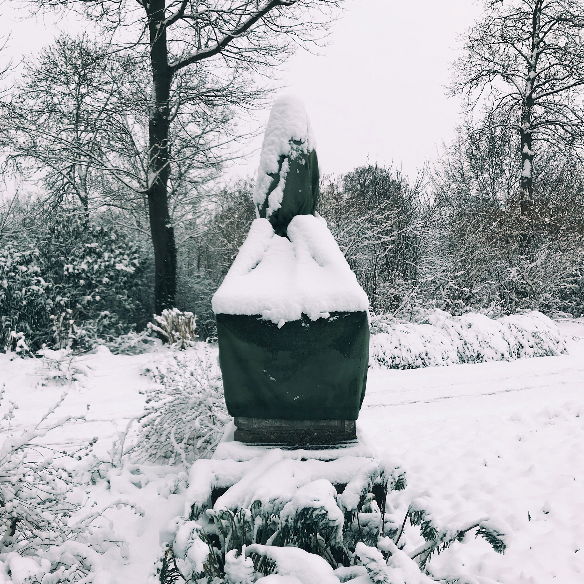 Sculptures "emballées" pour l'hiver. Château de Compiègne (Oise). Février 2018